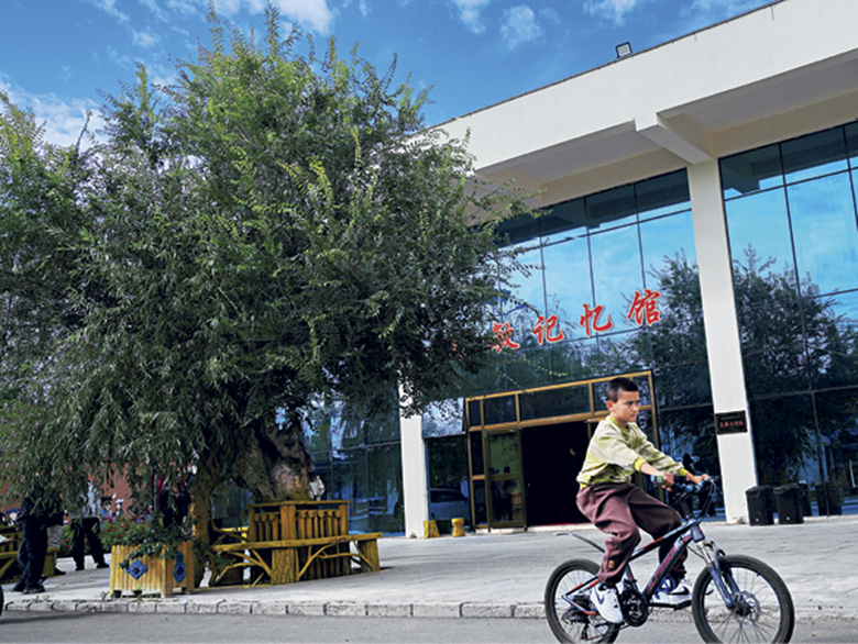 Un enfant à vélo passe devant un arbre dont le tronc principal est un saule et le tronc secondaire un orme, symbole de l’unité entre les différents groupes ethniques, dans le district d’Emin (Xinjiang).