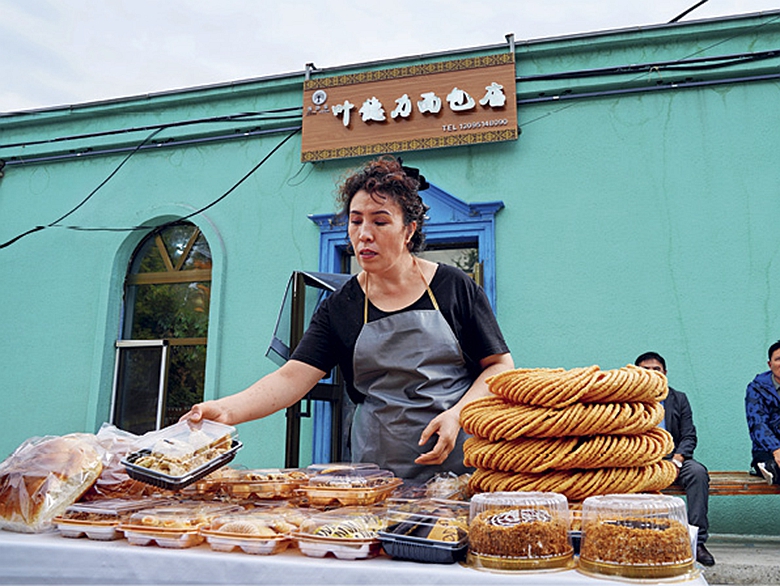 Une employée d’une boulangerie arrange les marchandises à vendre dans le district d’Emin (Xinjiang). (PHOTOS : YU JIE)