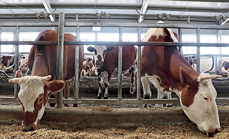Bovins dans une étable de l’entreprise Mengyuan Agricultural and Animal Husbandry Development, le 1ᵉʳ août