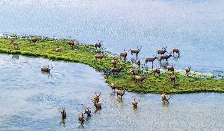 Des cerfs du père David dans la zone humide de la mer Jaune, à Yancheng (Jiangsu)
