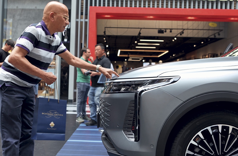 Le constructeur chinois Chery présente ses véhicules entièrement électriques et hybrides rechargeables au public néerlandais dans un centre commercial de La Haye, le 13 juin 2025.
